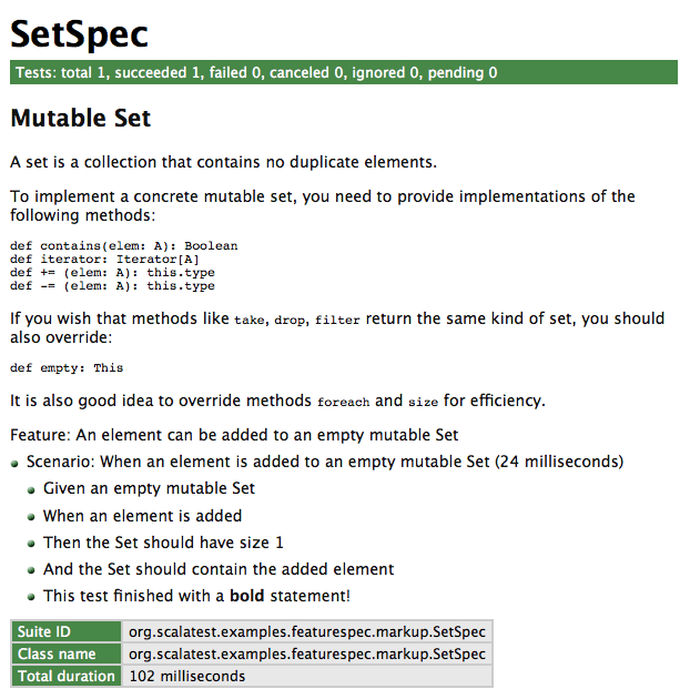 Feature("An element can be added to an empty mutable Set") { Scenario("When an element is added to an empty mutable Set") { Given("an empty mutable Set") val set = mutable.Set.empty[String]
