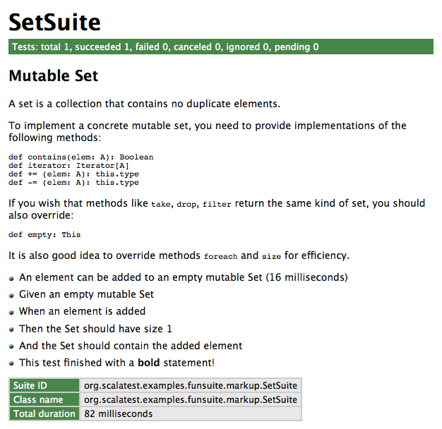add nicely formatted text to HTML reports. Here's what the above SetSpec would look like in the HTML reporter: